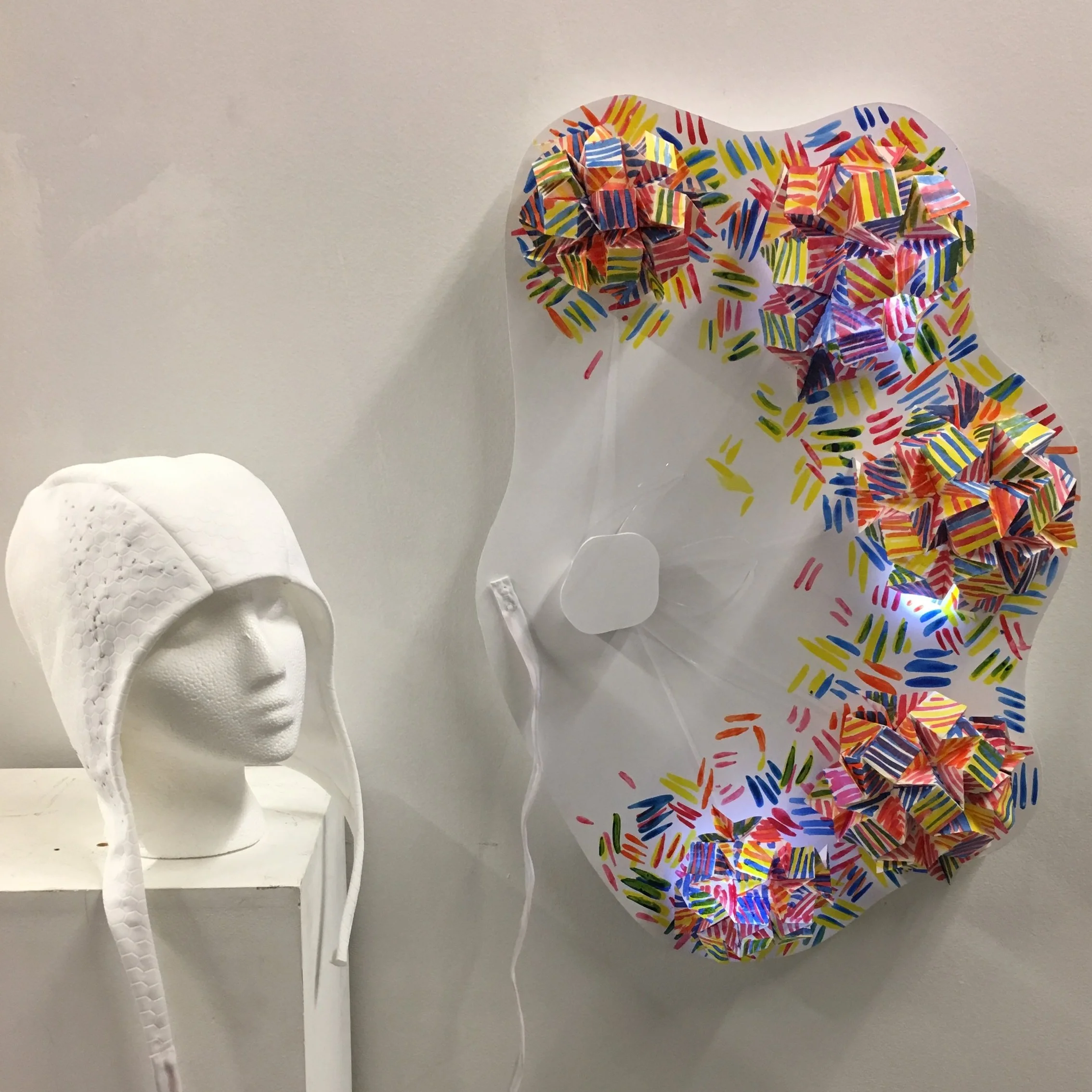 A soft fabric hat with pressure sensors is connected to a wall-mounted kinetic sculpture, consisting of brightly handpainted painted paper origami tessellations with LED lights embedded underneath them. When the wearer applies pressure to one side of their head through the hat, the origami pieces pulsate and blink faster, simulating the visual hallucination symptoms of a typical migraine aura.